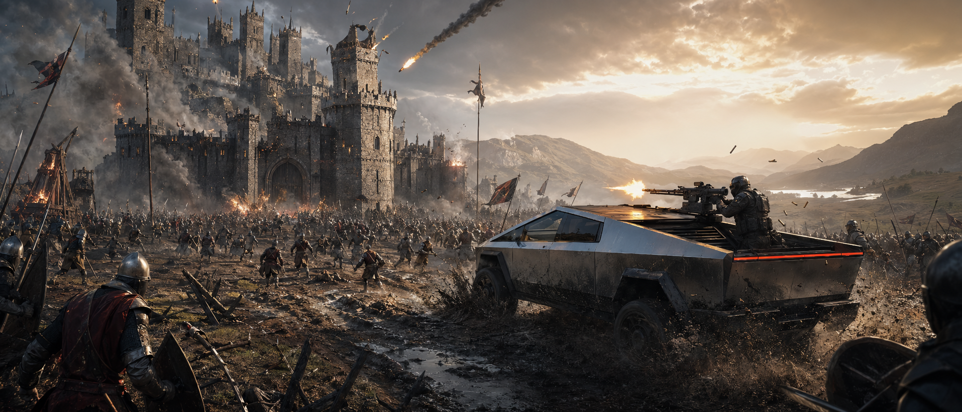 A full-scale medieval battlefield gets hit with armored trucks, artillery fire, drone tactics, and four-player chaos.